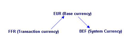 The definition of base currency is; the currency to which all transaction currency exchange rates should be expressed. This means that an amount that is to be calculated from FFR (transaction currency) into BEF (system currency) must be calculated through the EUR (base currency).