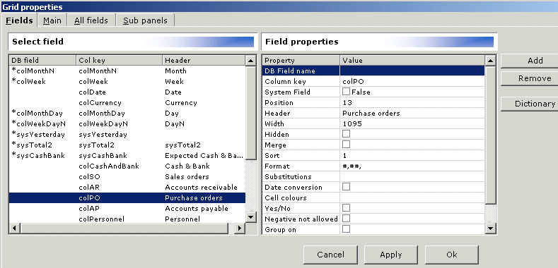 - All available fields (grid columns) are listed in the Select field part to the left. The properties for the selected field are shown in Field properties to the right. To view information for another field, click on the applicable field in the left part of the panel. The pertaining detail information is displayed to the right.
