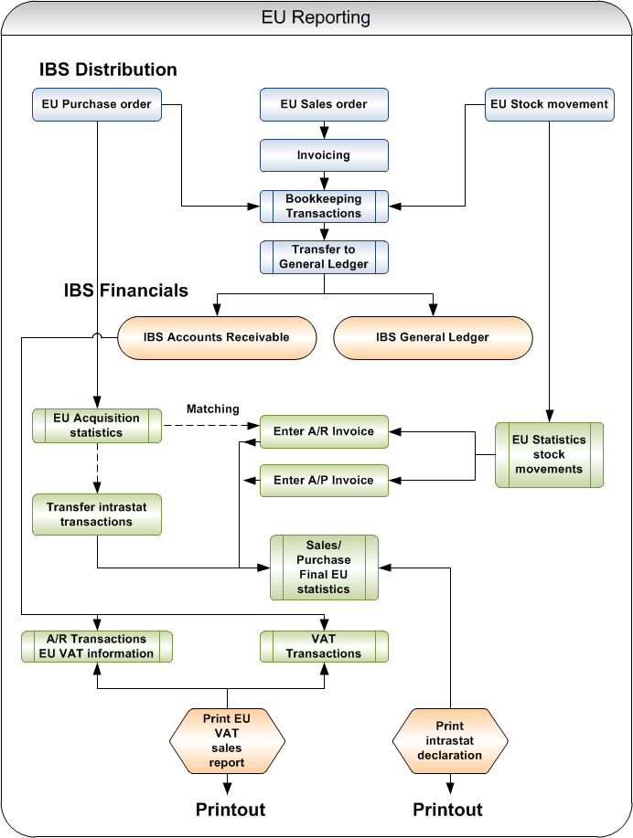 Home /User Guides/Distribution/EU Reporting EU Reporting Related topics Flowchart Several routines in IBS Distribution are influenced by the EU reporting functionality (EU VAT sales report and INTRASTAT declaration). Related topics EU order handling EU stock handling Country functionality Standard features
