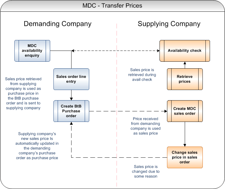 The following describes how the sales price of items in supplying company is transferred to and becomes purchase price in the demanding company in a BtB sales order of type MDC. It is important to note that there is no difference between a BtB transit or direct delivery order when using this functionality.