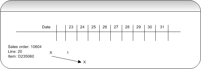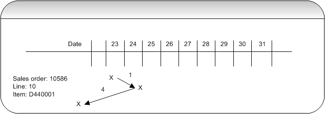The following describes what happens in the Time axis file during the re-planning in update mode. The first group of information (in tables) outlines the purchase order selected in and the sales order lines that contain these items. The second group of information (graphical illustrations) outlines the “movement” or actions taken during the re-planning for each sales order line.