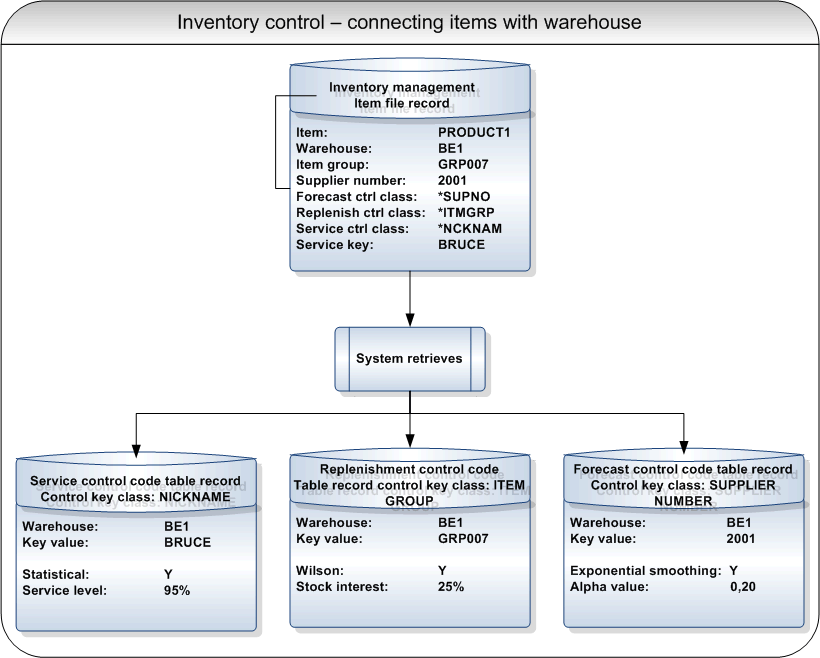 You must assign a forecast control code, a replenishment control code, and a service control code for each item/warehouse combination in the system. These codes refer to the information defined in the corresponding control code table to calculate forecast, economic order quantity (EOQ), reorder point (ROP), and safety stock level (SST) for this item/warehouse combination.