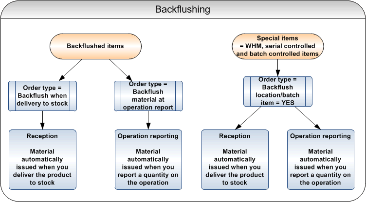 Items that are defined as backflushed are issued automatically. The system calculates the material that has been issued during operation reporting or reception from manufacturing orders. The quantity being backflushed can be equal to or less than the quantity on the manufacturing order. The types of items that can be issued automatically are displayed below: