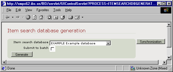 You can generate and/or synchronise a new/existing database. The synchronisation process allows any changes that have taken place in the IBS Enterprise Item file to be updated in an existing generated database. To generate/synchronise an item search database, do as follows: