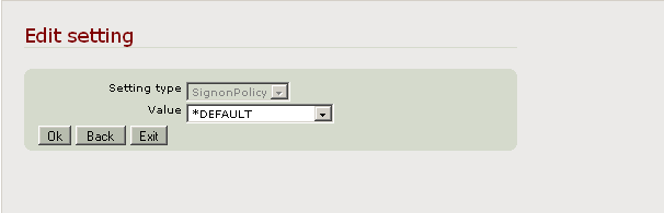 - On the Settings window, select the setting SignonPolicy and click the Edit button.