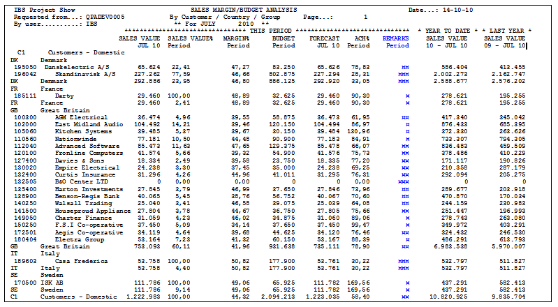 As you can see on the printout, Percentage marking 3 (¤¤¤) is printed for customer 189603 (Casa Frederica). This is because the sales value for this customer is only 30,22 % of the budgeted value (as shown below column ACH%), and 30,22 % is below Percentage limit 2 (50 %).