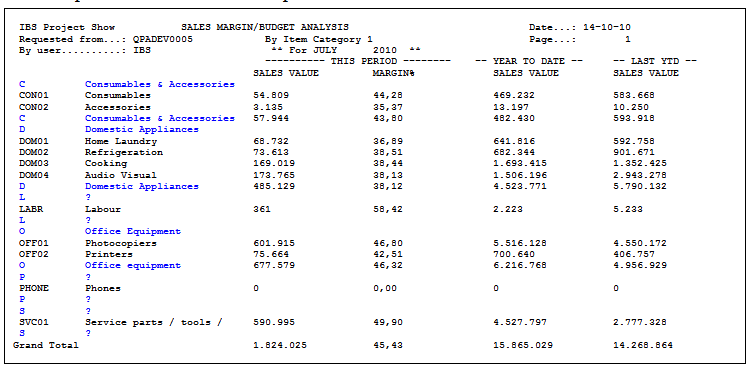 Only the break levels defined in the Break level text table (C, D and O) are printed. The text defined for each break level is also printed (i.e. Consumables & Accessories, Domestic Appliances and Office Equipment).